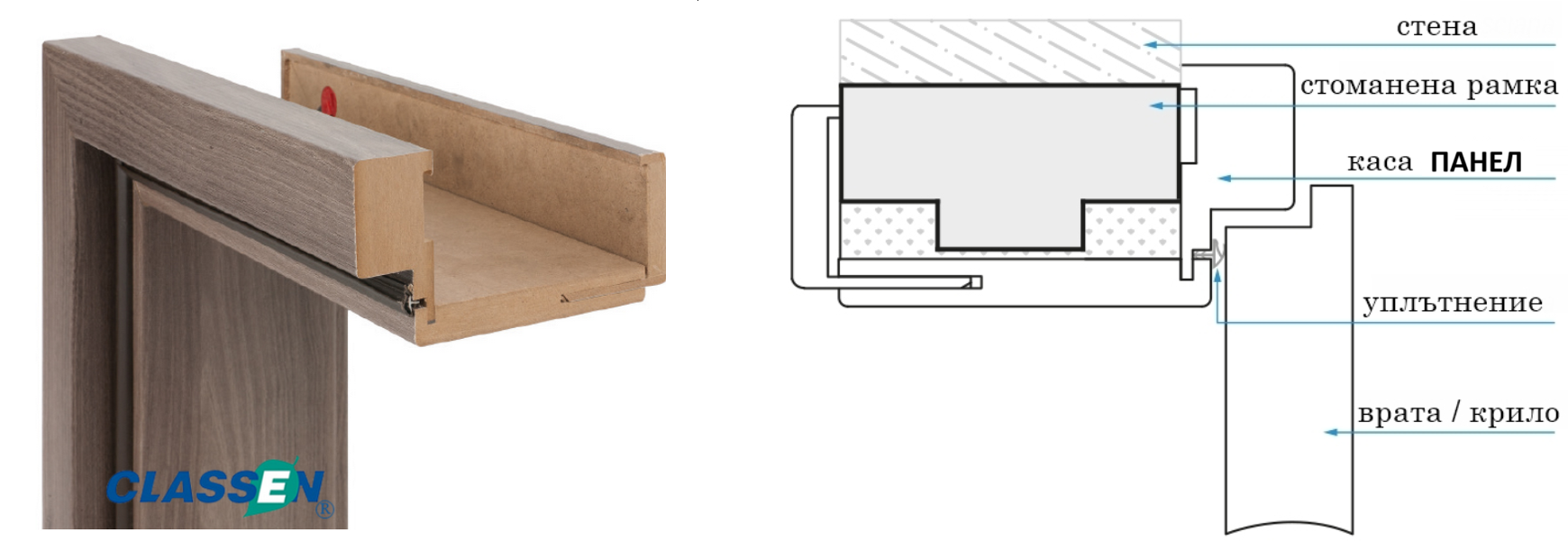 Каса Панел Classen е позната още като камуфлажна каса (обличаща каса), отличава се с възможността да се монтира върху съществуваща стара метална каса, без да се налага да демонтирате и къртите старата Ви каса. Предлага се в два размера 7/11см и 11/15см, в комплект с первази (един фиксиран и един плаващ). Подходяща е за всички модели интериорни врати Classen с размери на крилата 60′, 70′ и 80’см .