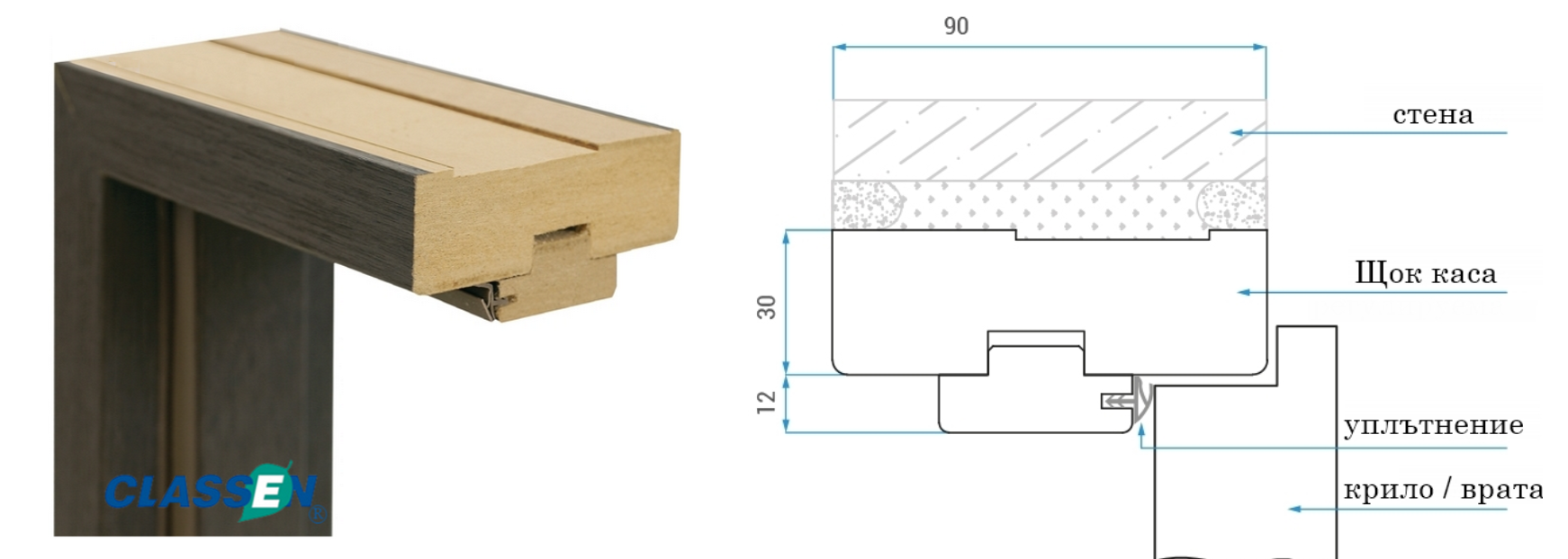 Стандартна каса Щок Classen е обикновена права каса, подходяща е за всички модели интериорни врати Classen. Стандартната каса Classen е позната още като ЩОК каса, тя е най-малката стандартна права каса с дебелина 9см.