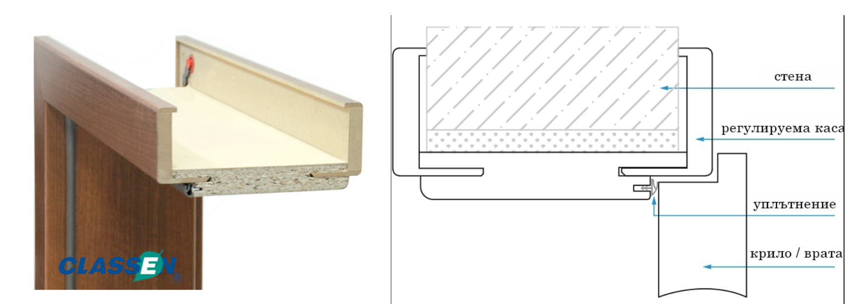 Регулируема каса Classen е позната още като компенсаторна каса, отличава се с възможността за регулиране и по-големия обхват на външния габаритен размер. Предлага се в различни размери в комплект с двустранно компесаторни первази (плаващи от едната страна), които покриват целия отвор и не се налага замазване след монтажа (подмазване). Подходяща е за всички модели интериорни врати Classen.